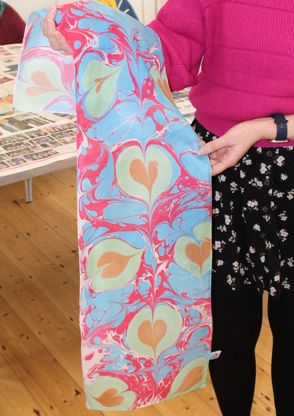 Marbling is a beautiful and satisfying medium which requires no previous experience or the ability to draw! It’s perfect for beginners and for people who want to play with the medium which has endless possibilities for the more accomplished artist. In this session we’ll be using traditional marbling techniques and we’ll demonstrate and create a number of traditional designs together. We’ll make beautiful papers and the chance to create your own notebooks with our super heavy duty guillotine.